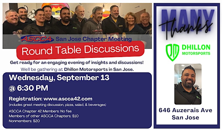 Get ready for an engaging evening of insights and discussions! We’ll be gathering at Dhillon Motorsports in San Jose, and here’s what you can expect: